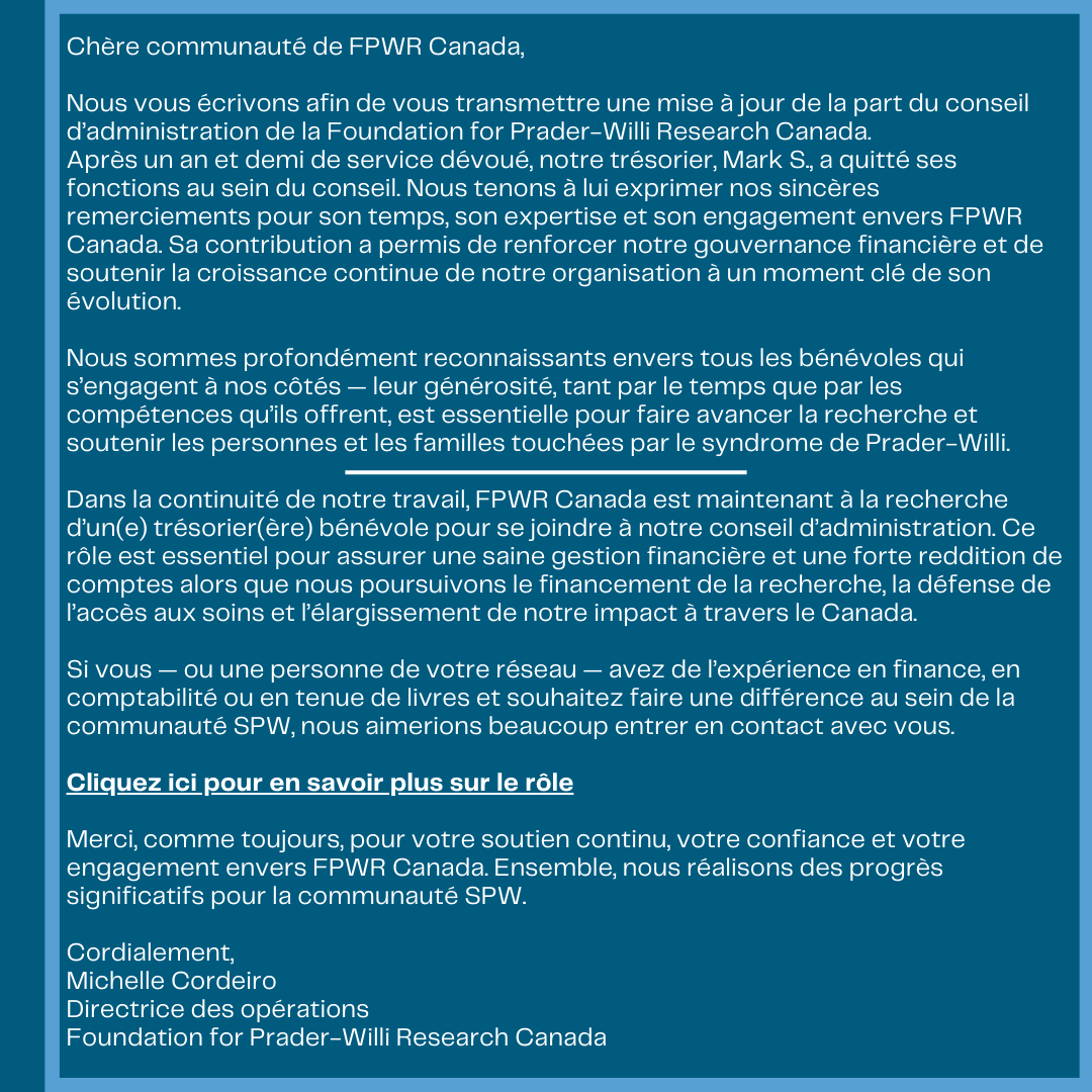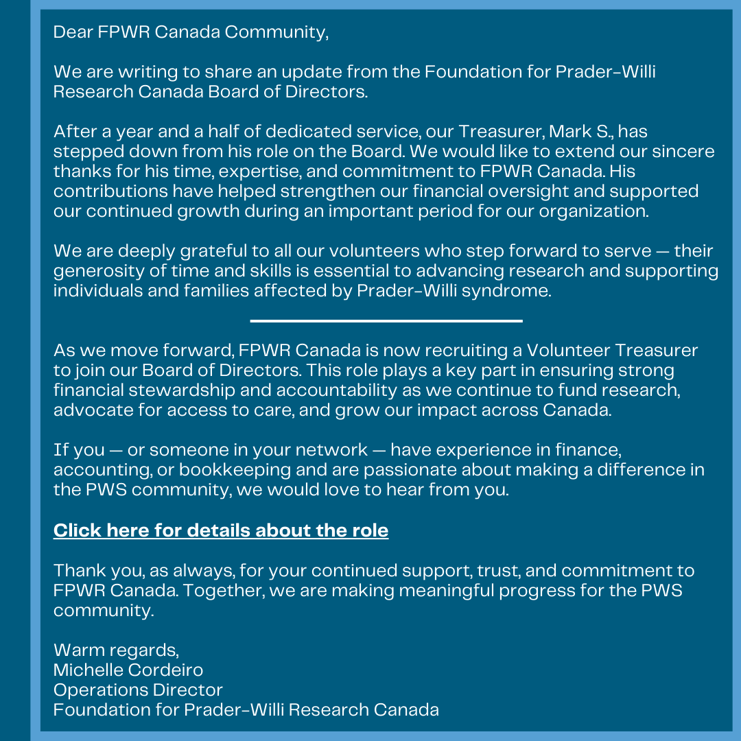 The mission of FPWR Canada is to eliminate the challenges of Prader-Willi Syndrome